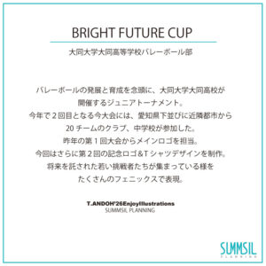 バレーボールの発展と次世代の育成を念頭に、大同大学大同高校男子バレーボール部が開催するジュニアトーナメント「BRIGHT FUTURE CUP」大会記念ロゴマークを制作しました。